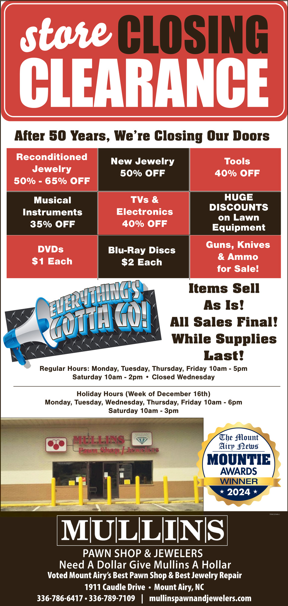 Dec 07, 2024. Mullins Pawn Shop & Jewelers Pawn Shop Ads from Mt. Airy News