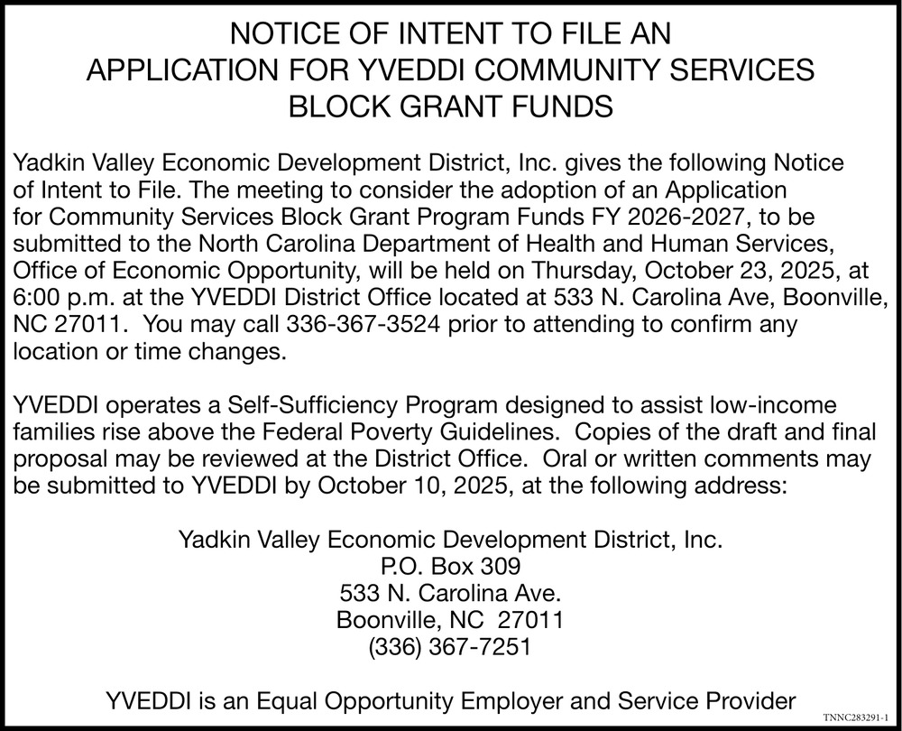 Oct 08, 2025. Yadkin Valley Economic Development District, Inc Notice Ads from Mt. Airy News