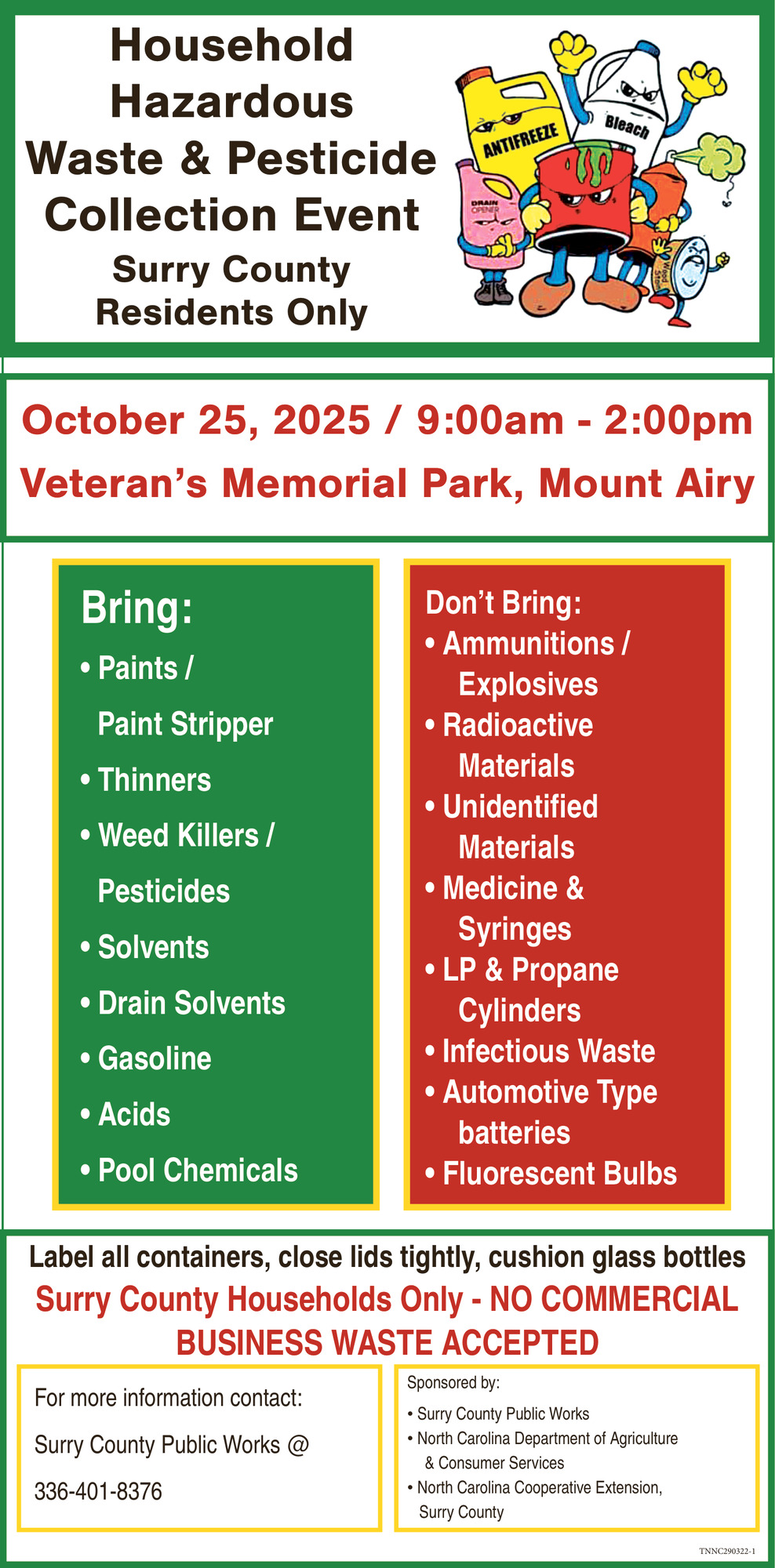 Oct 11, 2025. Household Hazardous Waste & Pesticide Collection Event Events Ads from Mt. Airy News