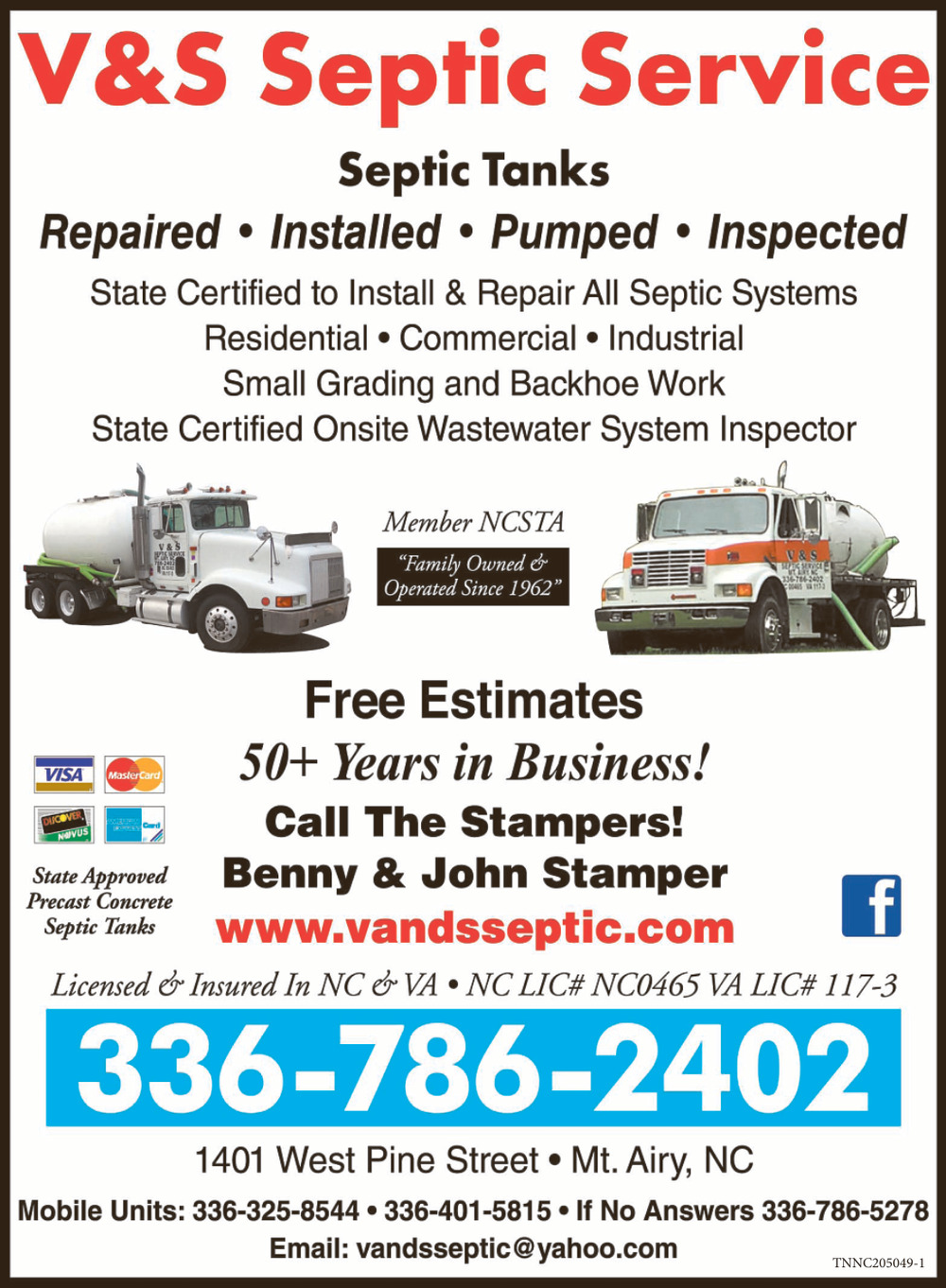 Ads for V&S Septic Service in Mount Airy, NC