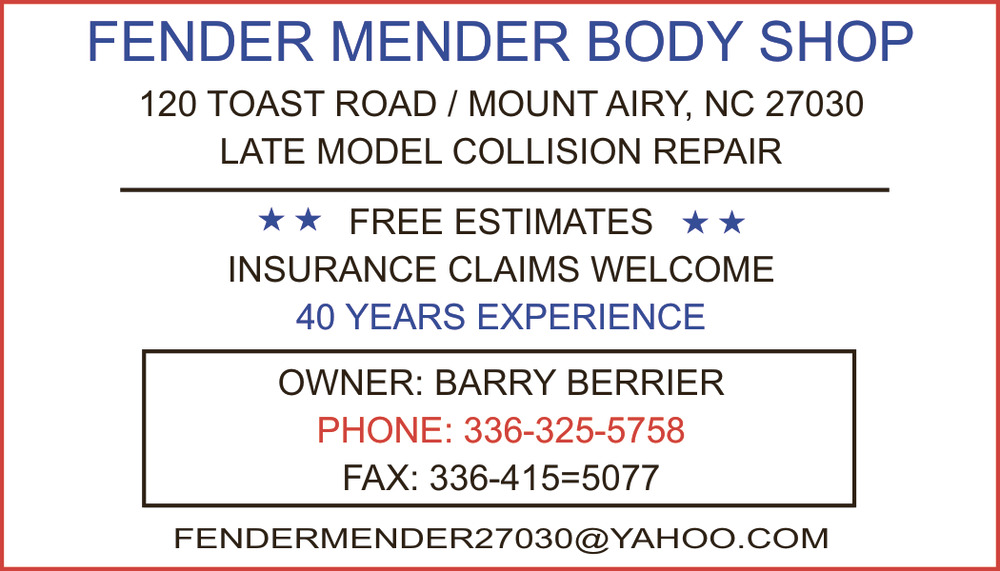 Feb 26, 2026. Fender Mender Body Shop Auto Services Ads from Mt. Airy News