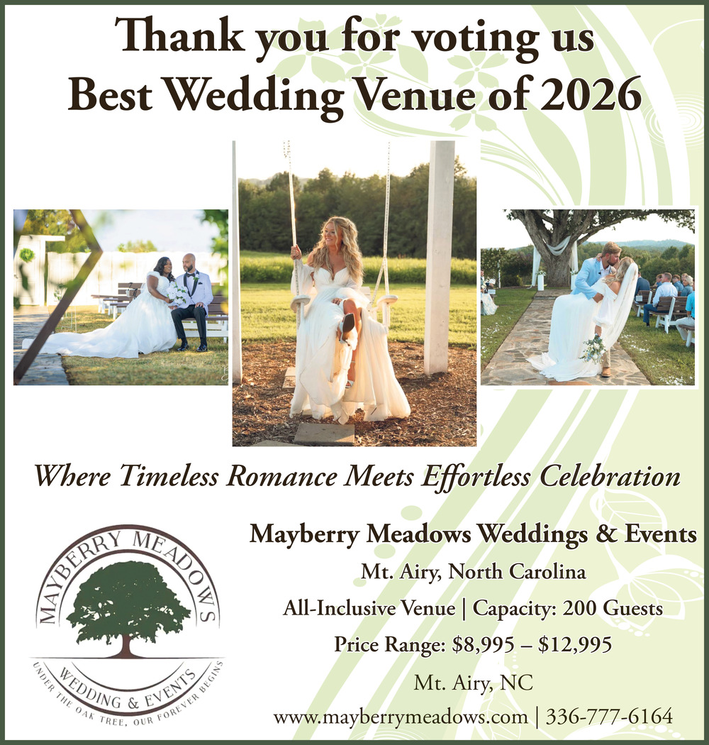 Apr 30, 2026. Mayberry Meadows Event Center Ads from Mt. Airy News
