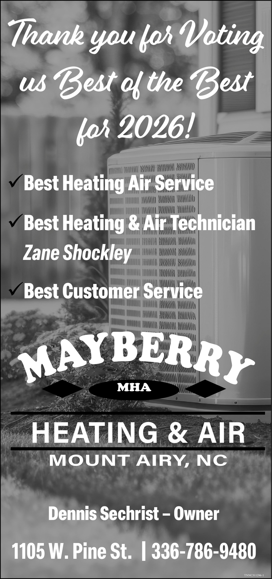 Apr 30, 2026. mayberry Hearting & Air Heating & Cooling Ads from Mt. Airy News